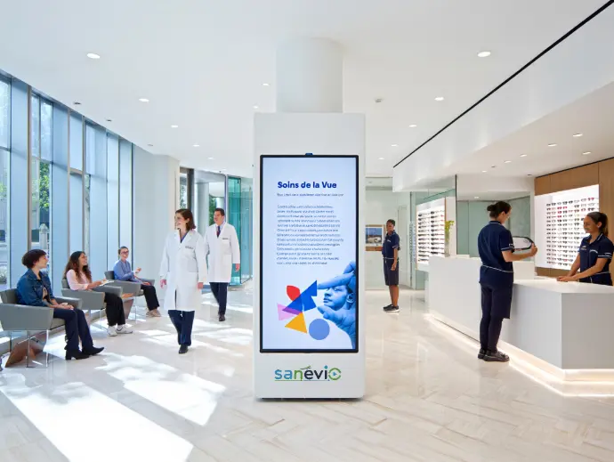 Réseau d'écrans dans les pharmacies, cliniques et hôpitaux partout en France.